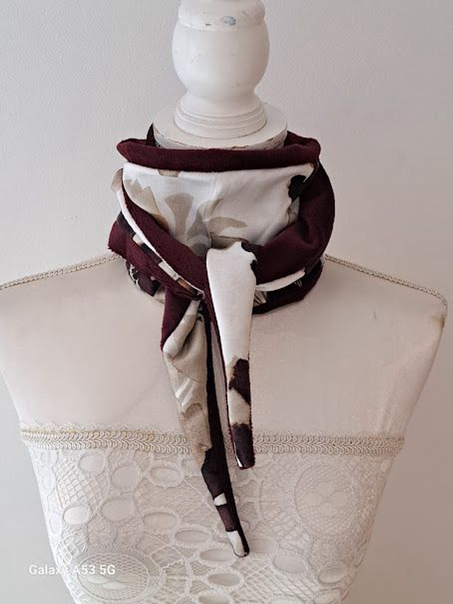 Réalisé dans un tissus motif floraux et un tissus minky lisse très doux au toucher de couleur bordeau.