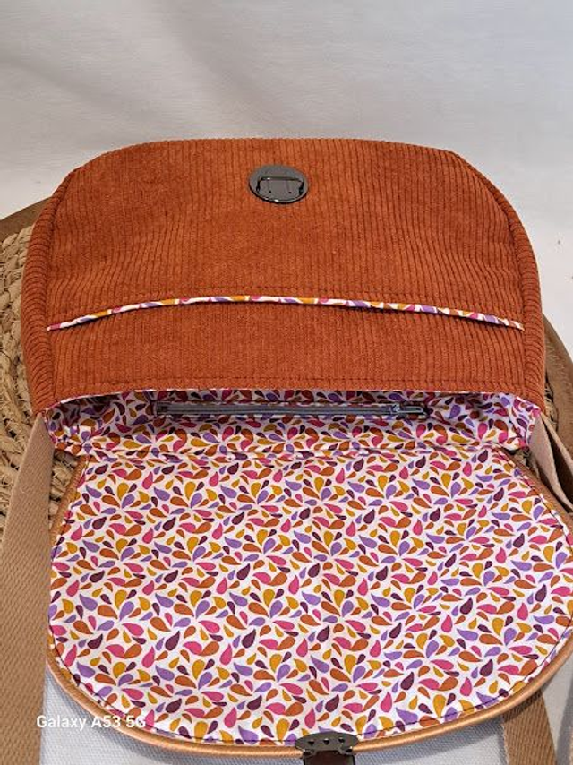 Sur le rabat un tissus coton motifs feuillage avec une finition par un passpoil doré.
