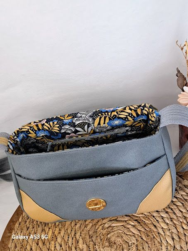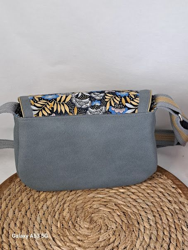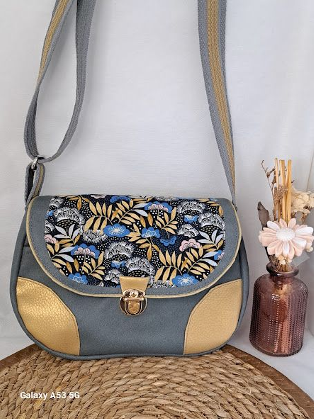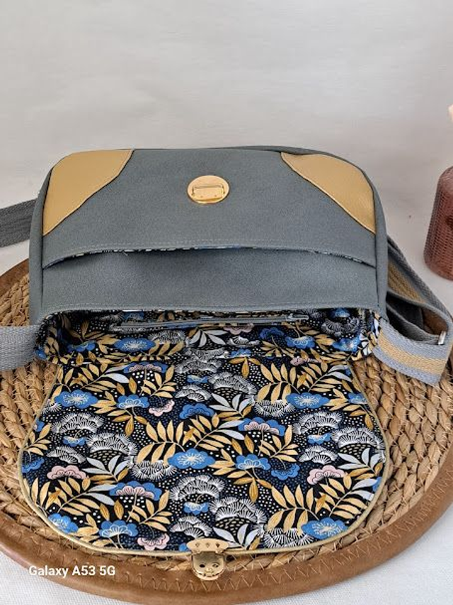 Sur le rabat un tissus coton motifs feuillages avec une finition par un passepoil doré.