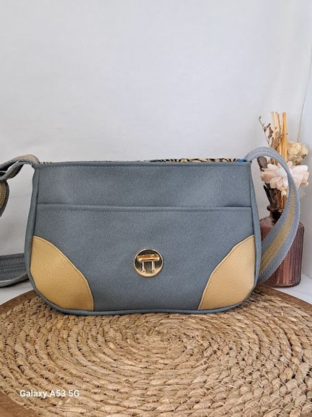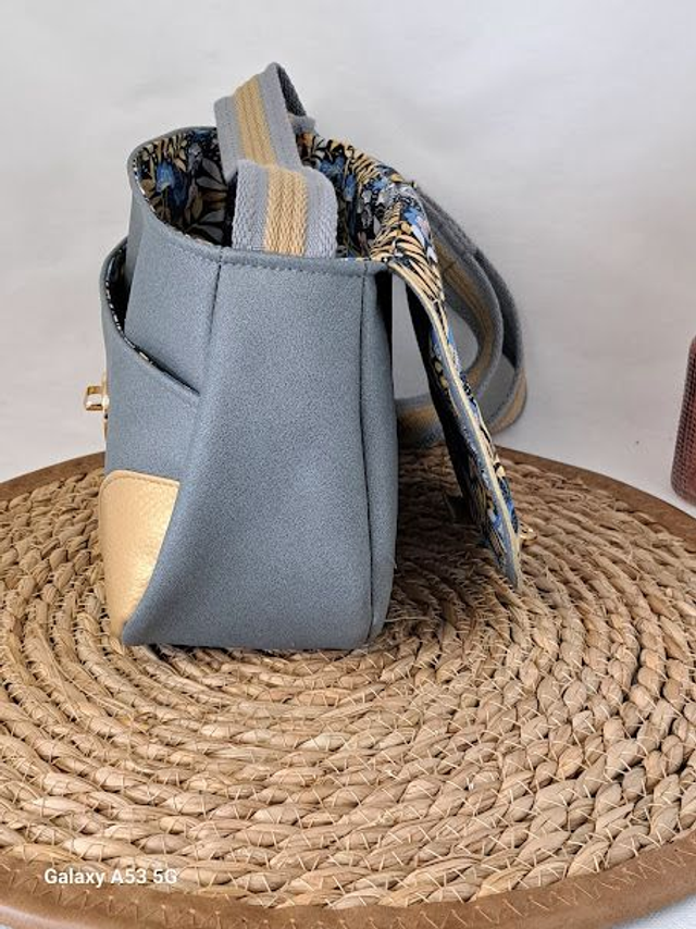 Tout dans un simili cuir de couleur gris, deux petits appliqués en simili cuir de couleur or doré.