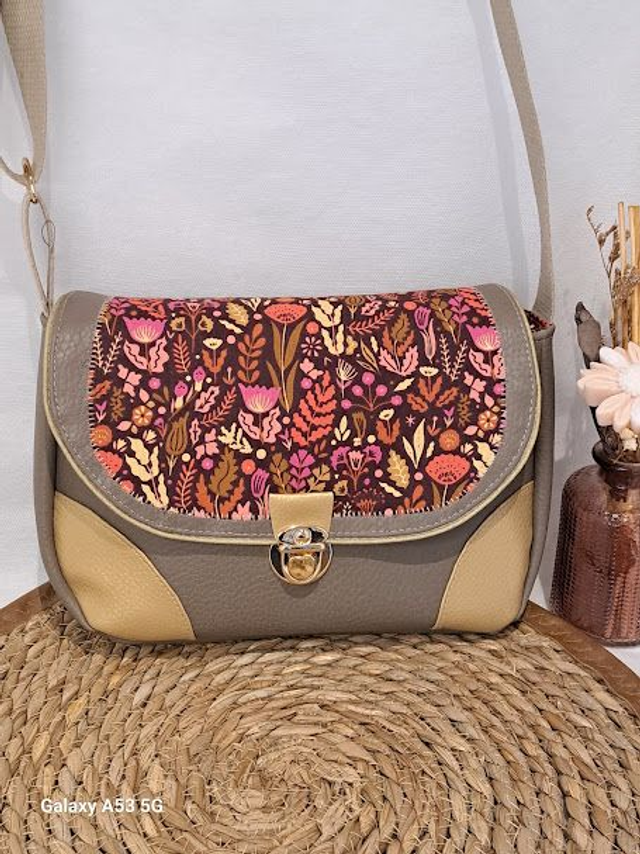 Sur le rabat un tissus coton motifs de fleurs avec une finition par un passepoil doré.