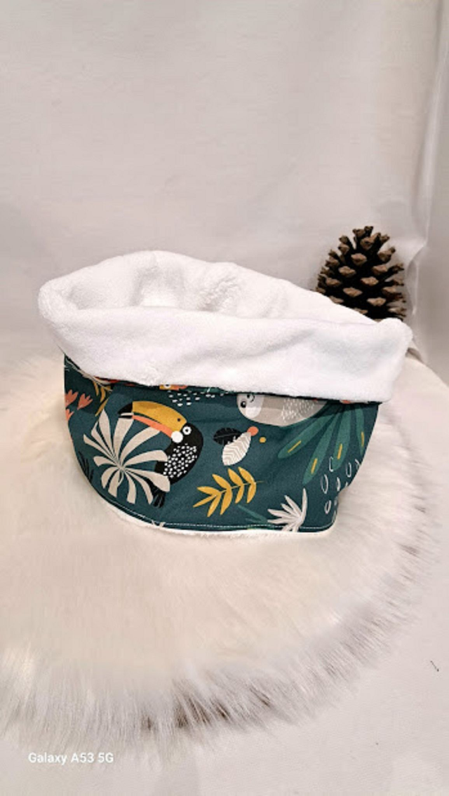 Réalisé dans des tissus coton aux motifs de la jungle où dinosaures, double d'une polaire pilou trés agréable au touché.