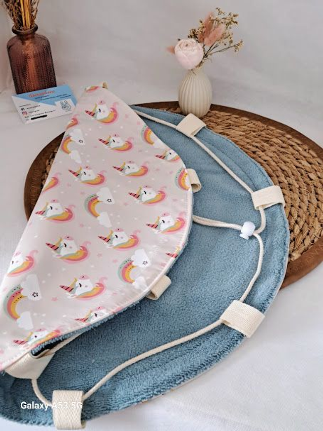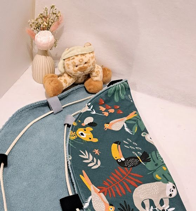 Ce sac astucieux avec une face éponge bambou très douce et l’autre en coton enduit :